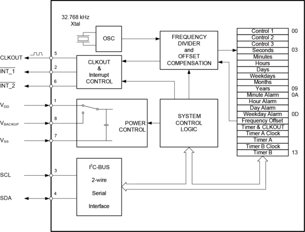 RV-8523-C3 is a CMOS real time clock / calendar optimized for low power consumption. Data is transferred serially via an I²C bus with a maximum data rate of 1000 kbit/s. Alarm and timer functions are available with the possibility to generate a wake-up signal on an interrupt pin. An offset register allows fine-tuning of the clock. The RV-8523 has a backup battery switch-over circuit, which detects power failures and automatically switches to the battery supply when a power failure occurs.